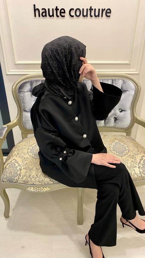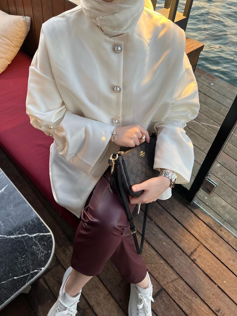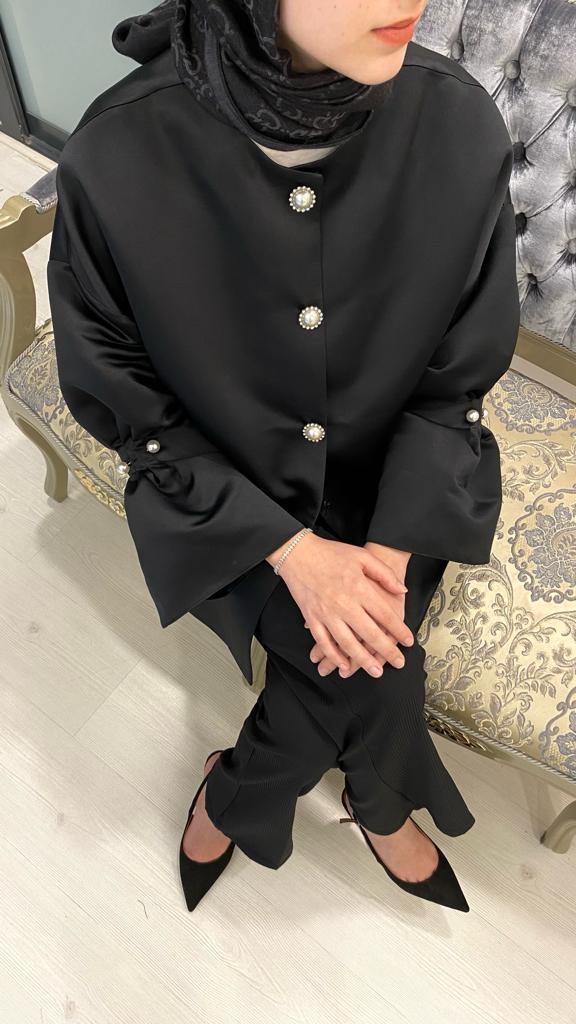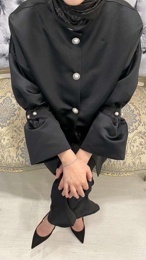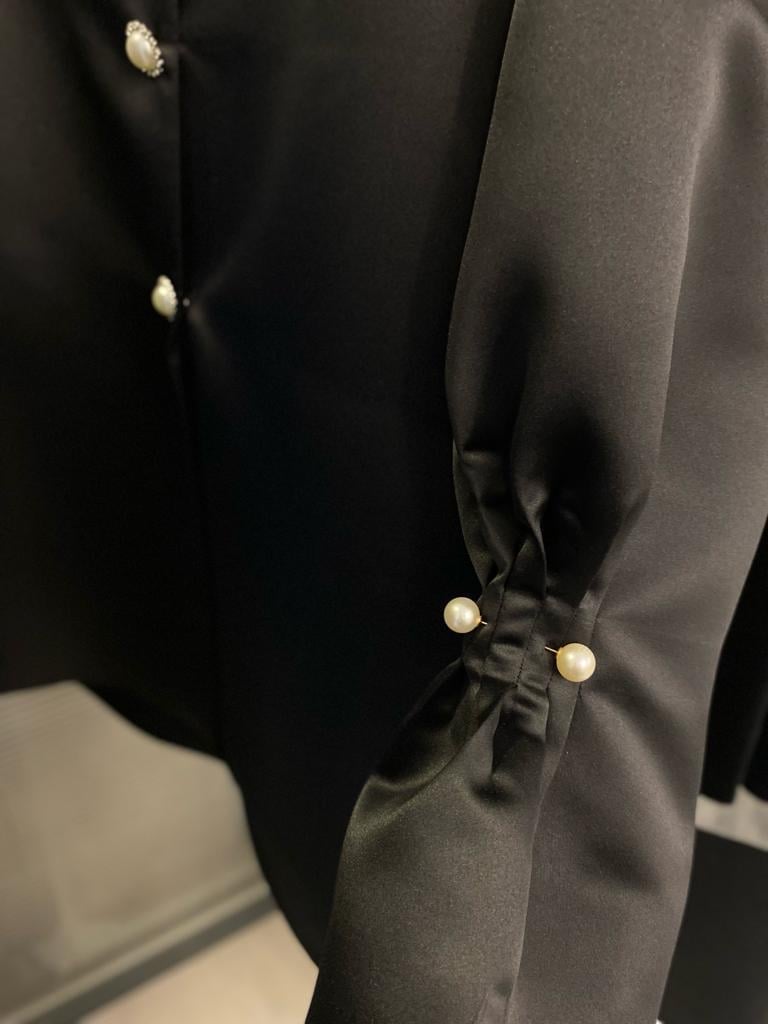 Pearl button and pearl pin detail on sleeves and front.